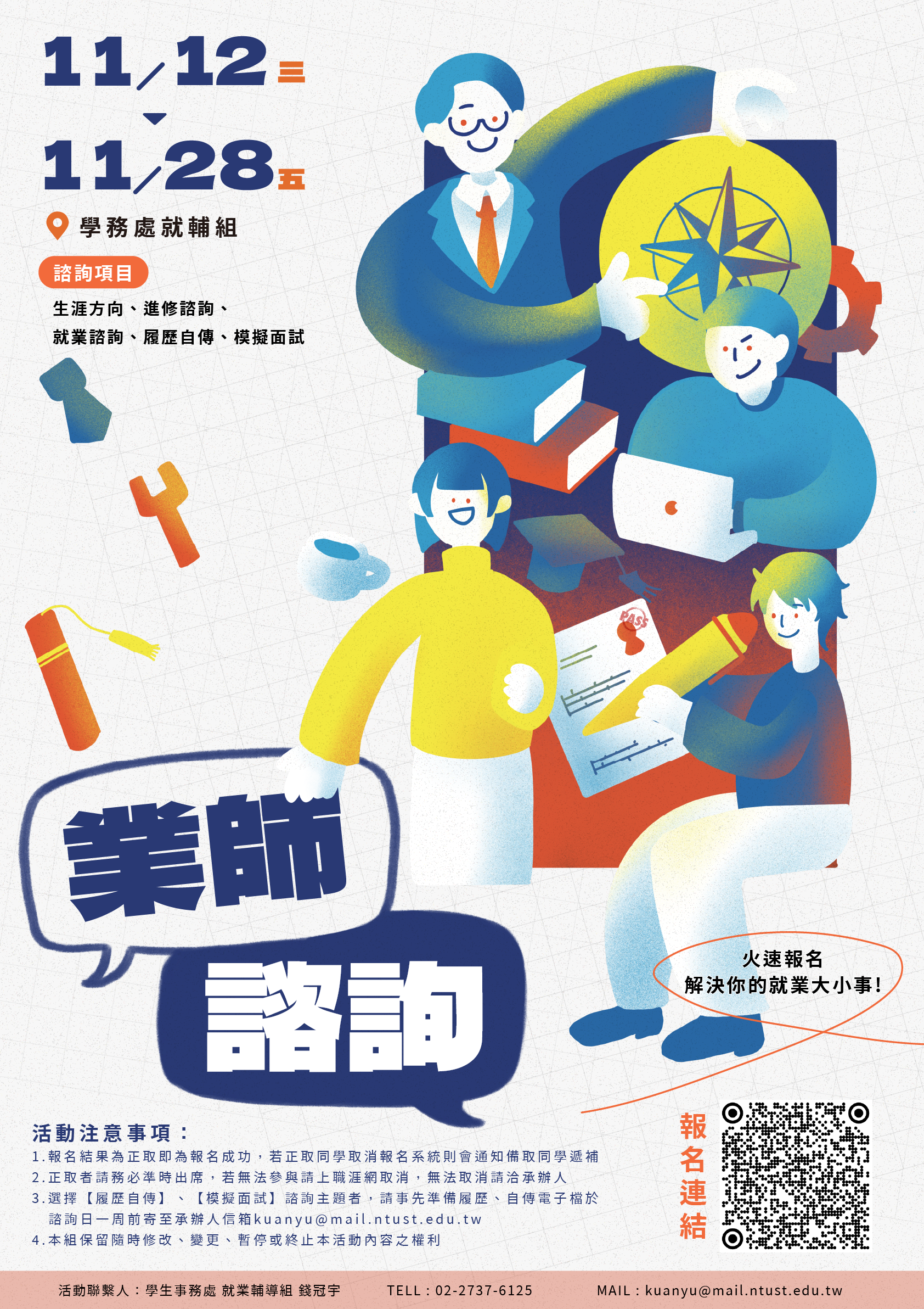 【諮詢地點】:學務處就業輔導組(學生活動中心二樓)