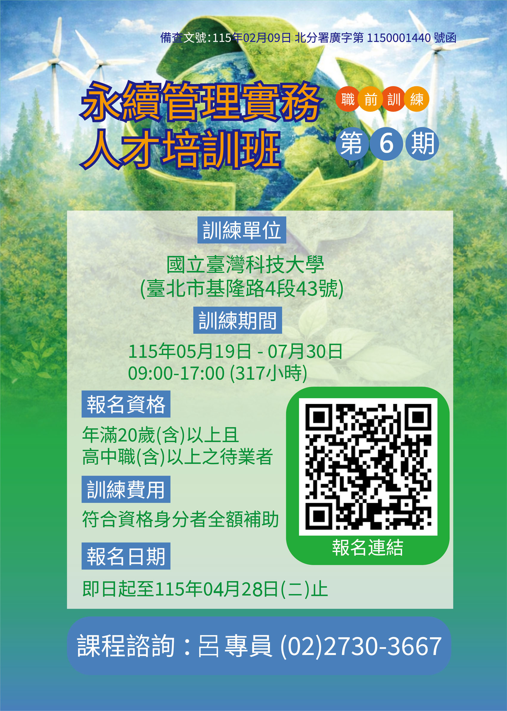 本課程為職前訓練課程,係以就業為導向之職業訓練,結合臺灣科技大學環工、綠能、管理等領域專家,以及產業界ESG 實務專家,規劃永續管理實務人才培訓班,期待透過完整訓練地圖培育「準綠領人才」。